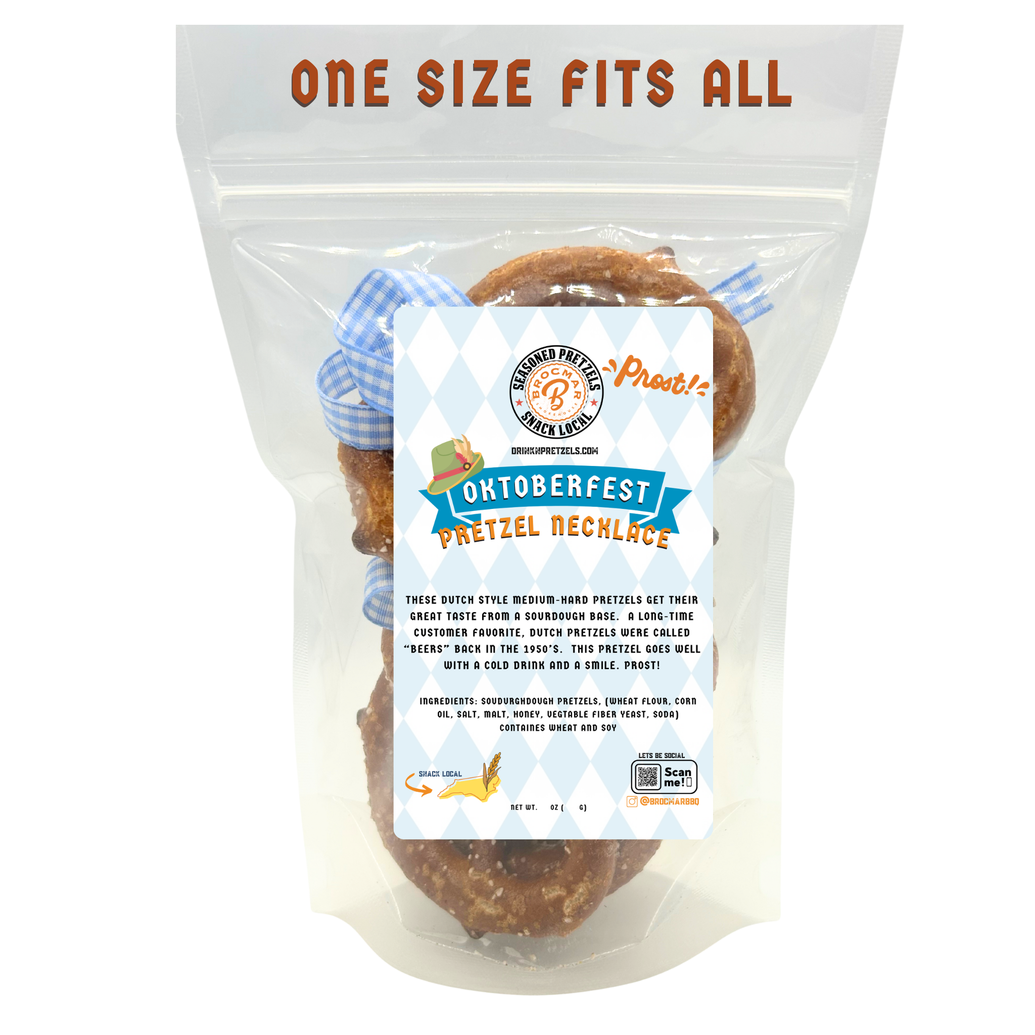 Experience the ultimate festival accessory with our exclusive handcrafted Octoberfest pretzel necklace – featuring 7 authentic Dutch hard sourdough pretzels made using our signature small-batch artisanal process in Wilmington, North Carolina.