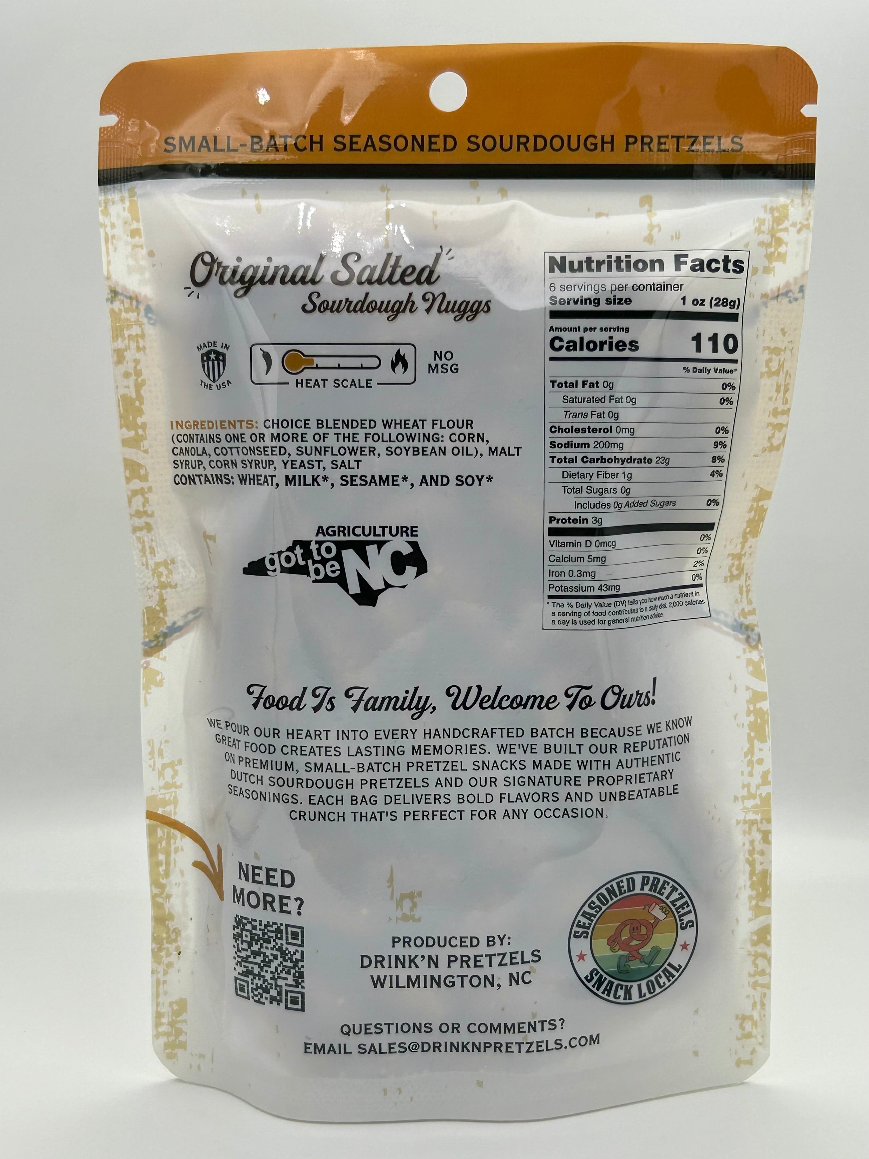 Discover the pure, authentic taste of Original Salted Sourdough Nuggs Drink'N Pretzels, crafted from a classic Dutch hard sourdough pretzel recipe. Each unique shaped piece features the perfect balance of premium sea salt, delivering that timeless, clean flavor that started it all.